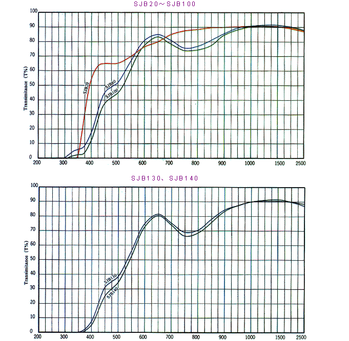 牌号 厚度(mm) A(2856K) D65 化学稳定性 ND α*10-7(/℃) Tg(℃) Ts(℃) S x y Y x y Y DA DW SJB20 2 0.469 0.413 87.8 0.339 0.349 83.6 2 3 1.525 87 571 642 2.63 SJB80 2 0.494 0.415 75.3 0.372 0.368 69.2 2 3 1.525 87 571 642 2.63 SJB100 2 0.510 0.410 67.8 0.385 0.381 61.0 2 3 1.525 103 513 591 2.70 SJB130 2 0.548 0.409 52.1 0.455 0.405 44.2 2 3 1.525 103 513 591 2.70 SJB140 2 2 3 1.525 103 513 591 2.70